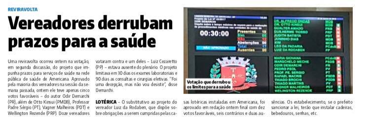 Aprovado em primeira discussão na semana passada, o projeto de autoria do vereador Odir Demarchi (PR) que visava estipular prazo máximo de espera para procedimentos na Saúde em Americana não passou na segunda votação nesta quinta-feira (1º). O parlamentar se disse decepcionado com a mudança de votos.